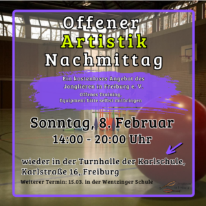 Hier finden Jonglierbegeisterte Informationen über Jongliermöglichkeiten und Termine rund ums Jonglieren in Freiburg und Umgebung. Auch findet ihr auf dieser Seite alle wichtigen Informationen zum jährlichen Freiburger Jonglierfestival.